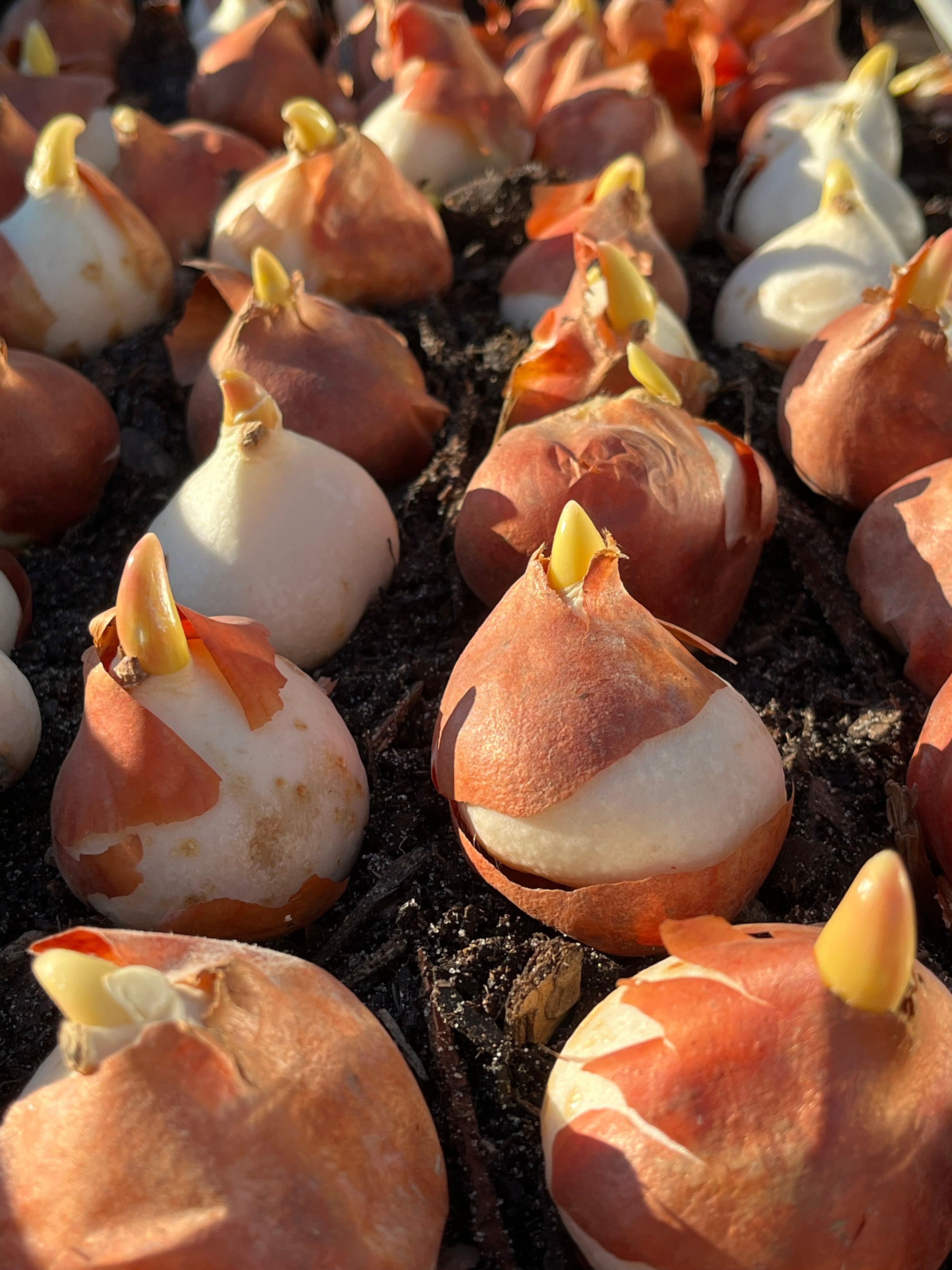 Choose a sunny spot and plant them outside. Bury your bulbs ~6’ deep, pointy side up (like a Hershey kiss), and water deeply. Fertilizers are not necessary (we don’t use any), because the energy for the plant is already stored in the bulb. It takes two weeks for strong roots to form, then you should see sprouts that will then bloom after another four weeks.
